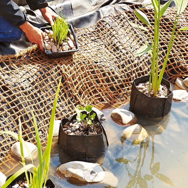 Multifunktionale Kokosmatte An steilen Teichwänden ist es fast unmöglich eine Bepflanzung anzubringen. Die Böschungsmatten und Taschen aus Naturfaser und Nylon leisten da Abhilfe. Die Matten werden einfach mit Steinen oder Befestigungsdübel fixiert und die Wurzeln der Pflanzen im Gewebe verankert. Die Pflanzen wachsen nach kurzer Zeit fest und bilden schöne Grünzonen in Ihrem Teich. Jutefasern sind biologisch abbaubar, diese sind durch ein hohes Wasseraufnahmevermögen erheblich schneller verrottbar, als sonst im Gelände. Manchmal kann es im Bereich des Wasserniveaus zu Problemen kommen wenn sich dieser permanent verändert, geht der Prozess schneller voran als sonst. Der Nutzen der Böschungstaschen ist, den Pflanzenballen und dem Wurzelwerk bis zur vollständigen Entfaltung der Wurzeln einen gewissen Halt zu gewähren.
