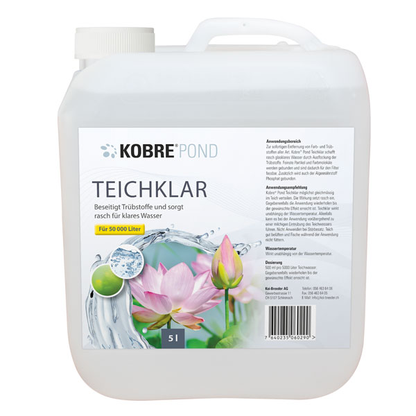Zur sofortigen Entfernung von Farb- und Trübstoffen aller Art. Kobre® Pond Teichklar schafft rasch glasklares Wasser durch Ausflockung der Trübstoffe. Feinste Partikel und Farbmoleküle werden gebunden und sind dadurch für den Filter fassbar. Zusätzlich wird auch der Algennährstoff Phosphat gebunden.