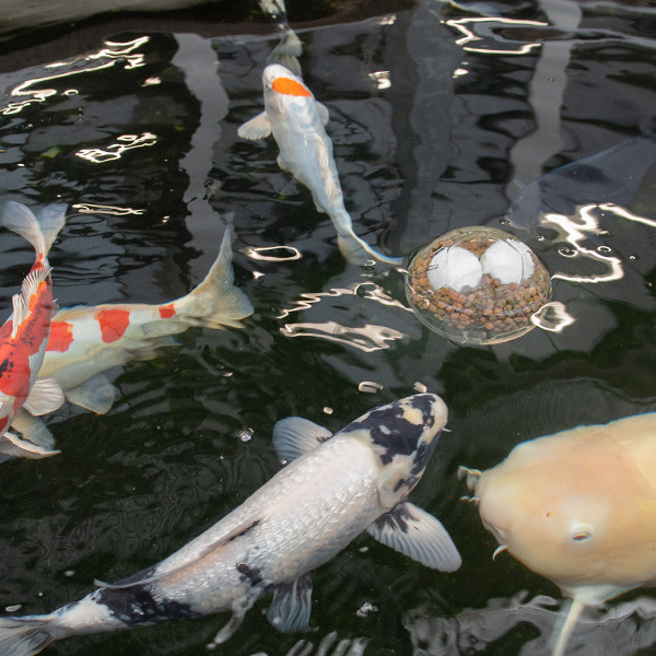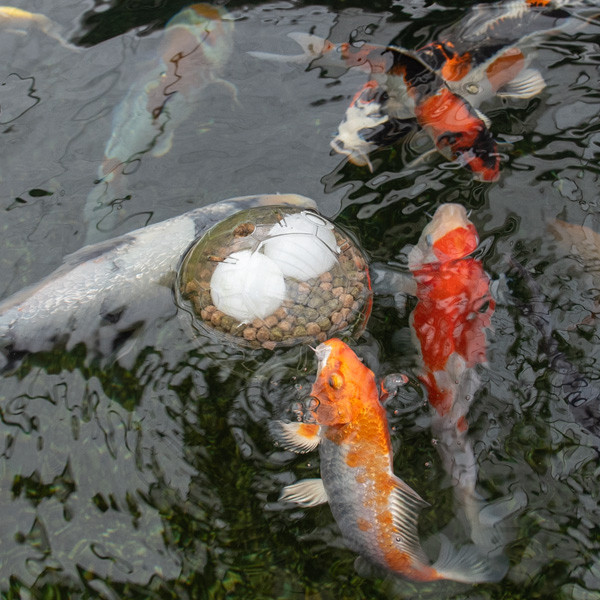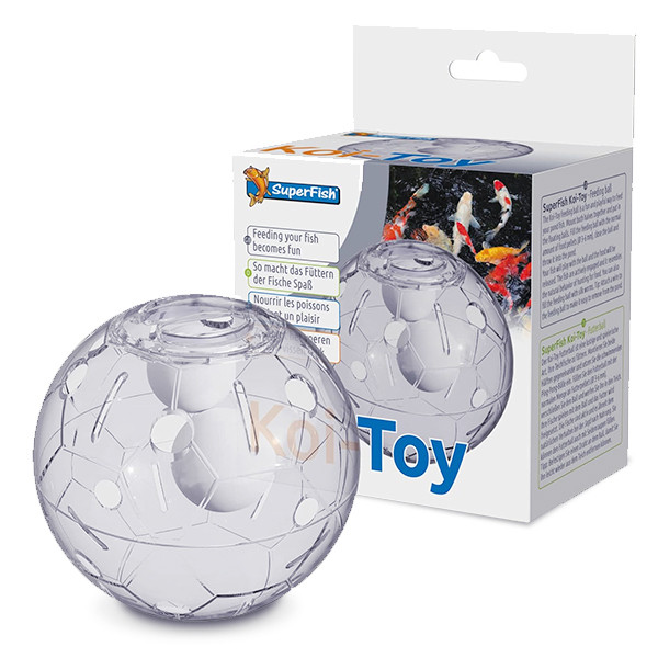 Der Koi-Toy Futterball ist eine abwechslungsreiche Art, Ihre Teichfische zu füttern. Stecken Sie die beiden Hälften zusammen und setzen Sie die schwimmenden Tischtennisbälle ein. Füllen Sie den Futterball mit der üblichen Menge Futterpellets (Ø 3-6 mm), verschliessen Sie den Ball und werfen Sie ihn in den Teich. Die Fische spielen mit dem Ball und das Futter wird freigesetzt. Die Fische werden aktiv und ihr natürlicher Futtertrieb wird geweckt.